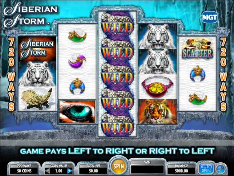 Der Online Spielautomat Siberian Storm ist ein äußerst interessanter Slot von IGT und zählt in vielen Casinos zu den beliebtesten Spielen des Herstellers. Beim Spielen reisen Sie in die vereiste Welt der sibirischen Tiger. Als Gewinnsymbole für die kleineren Gewinne begegnen Ihnen fünf verschiedene Schmuckstücke, wobei für die größeren Gewinne jeweils ein orangefarbener Tiger sowie ein weißer Tiger sorgen. Den Hauptgewinn jedoch gibt es, wenn der sibirische Sturm über die Walzen fegt, repräsentiert von der entsprechenden Aufschrift auf rotem Hintergrund. Ein Wild in Form eines zusätzlichen Tigers trägt die Funktion des Jokers und verhilft Ihnen so zu netten Extragewinnen zwischendurch. Des Weiteren gibt es einen Scatter, welcher als Multiplier fungiert. So erhalten Sie bei dreimaligem Auftreten das Doppelte Ihres Einsatzes zurück, bei viermaligem das zehnfache und bei fünfmaligem sogar das 50-fache. Darüber hinaus gibt es noch zwei verschiedene Tigeraugen, die in diesem Slot für Bonusspiele sorgen.